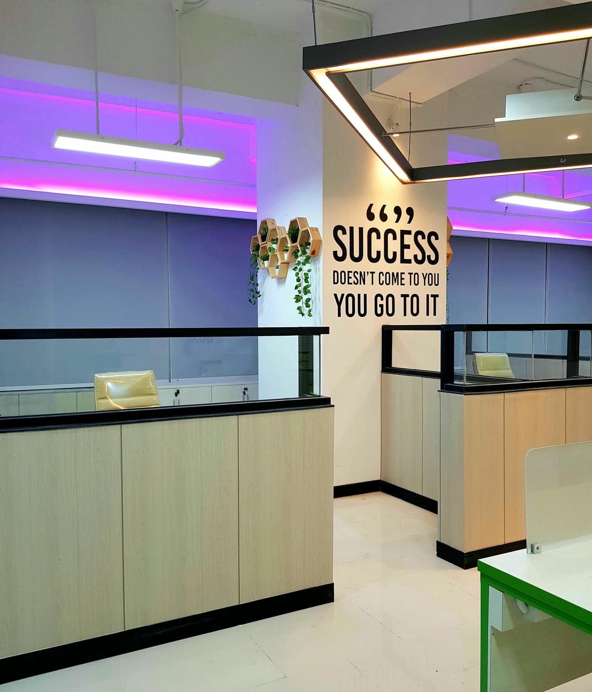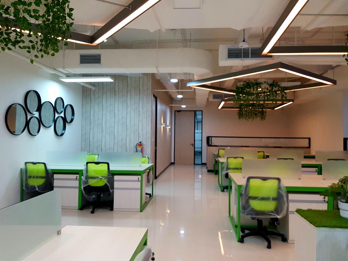 Pencahayaan natural dan buatan dimaksimalkan untuk memberikan kesan luas dan terang. Pemilihan warna netral dengan aksen tertentu memberikan nuansa modern dan profesional.